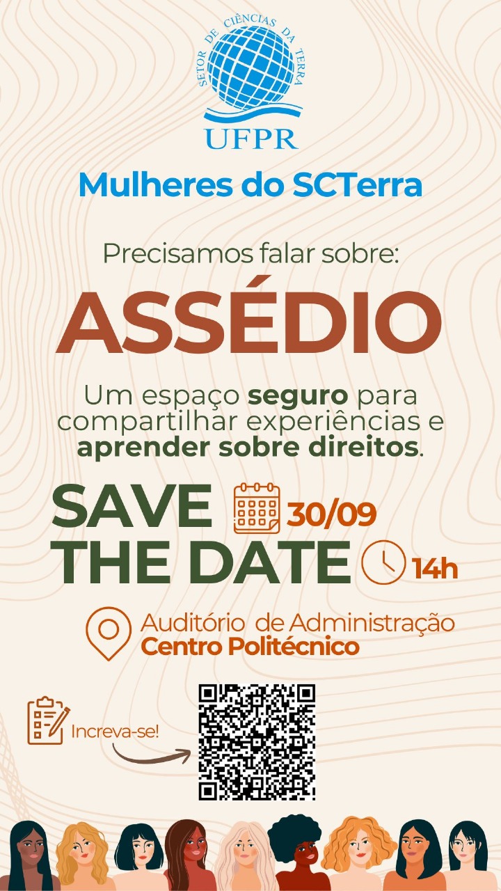 A Direção do Setor de Ciências da Terra está promovendo a palestra intitulada “Precisamos falar sobre Assédio”, que acontecerá no dia 30/09/2025, à s 14h no Auditório da Administração, Centro Politécnico.