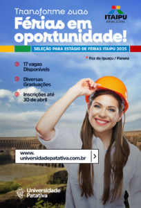 Vimos por meio deste divulgar o processo seletivo para estudantes de nÃvel superior interessados em participar do “Programa de Estágio de Férias” em Foz do Iguaçu/PR, promovido pela ITAIPU BINACIONAL – Margem Esquerda (Brasil) em parceria com a Universidade Patativa do Assaré (UPA).
